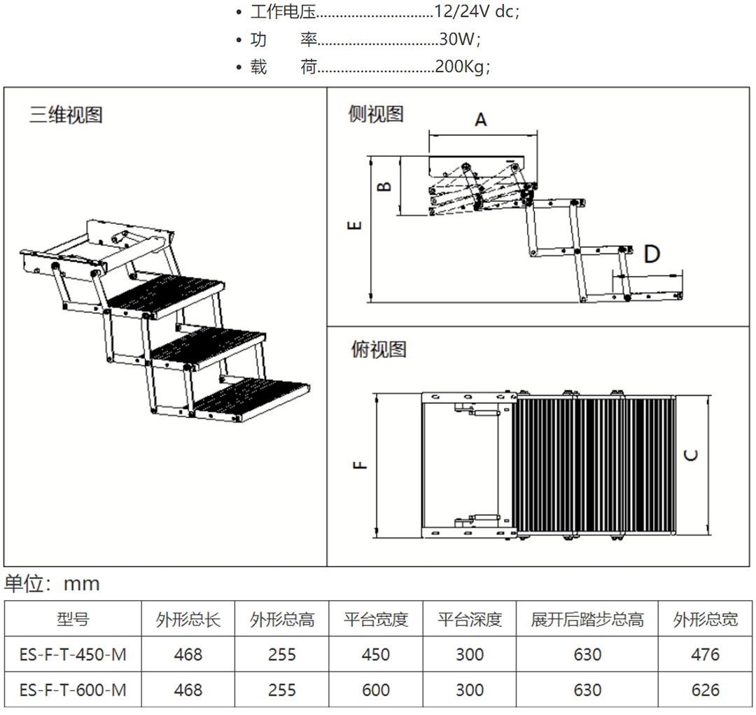 ES-F-T系列三级电动折叠踏步可广泛用于商务车、房车及救护车,可装在侧门踏步下。