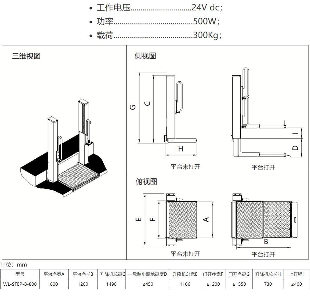 该升降机为半自动操作,可手动进行平台折叠及前挡板的操作,使用方便、可靠。