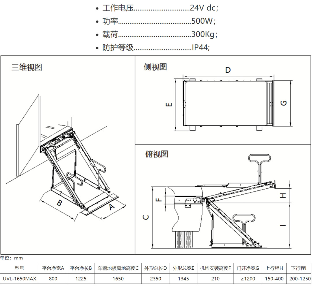 UVL-1650MAX系列轮椅升降装置采用电动及液动操纵方式,上下行程可达到1250mm,其主要功能为方便使用轮椅的乘客进出车辆。该系列升降机紧贴车辆大梁安装,不占用车内空间,不影响乘客及驾驶员视线。该系列升降机适合于安装在高地板客车后轮上方或紧贴车辆大梁安装,大大节省行李舱占用空间及不占用车内空间,不影响乘客及驾驶员视线。