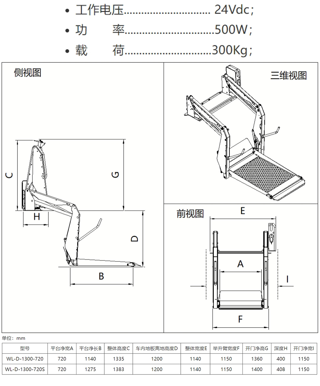 WL-D-1300-720客车用双臂轮椅升降机可用于大中型客车侧门,也可用于校车尾门, 举升高度达到1.2米。