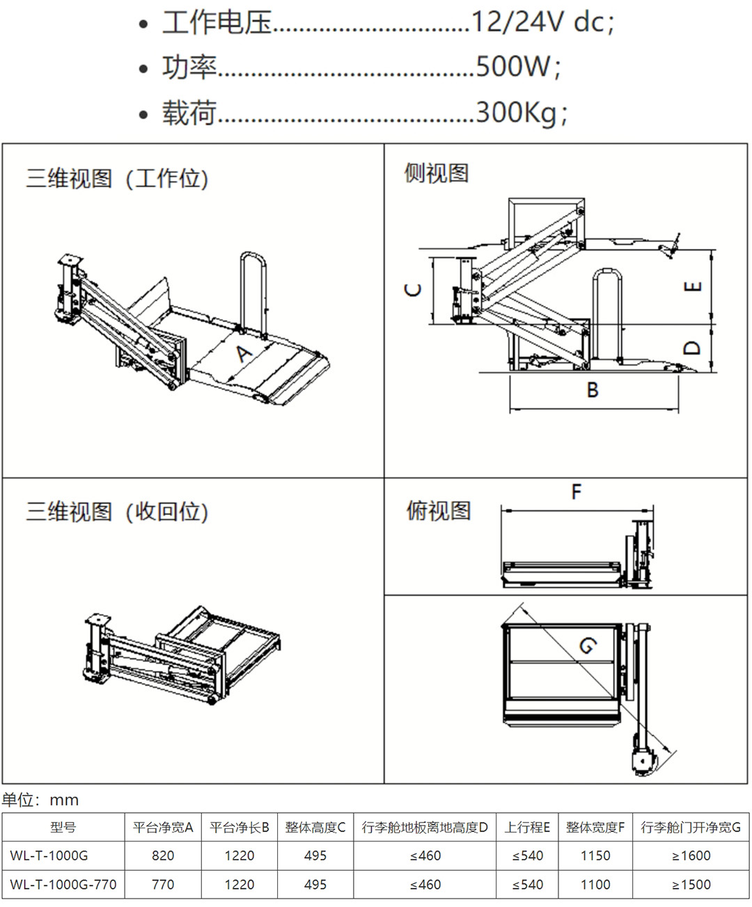 WL-T-1000G轮椅升降机主要安装于城市客车的行李舱内,车内地板高度小于1米,其主要功能为方便残疾人或其它需要帮助之人进出车辆。承载能力达到300Kg。