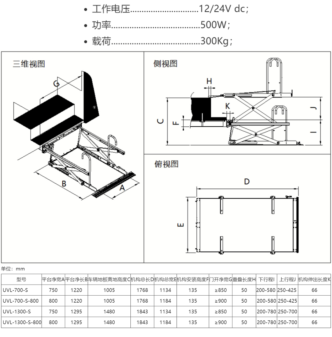 UVL-700-S/UVL-1300-S采用安装于车辆一级踏步的下方,不占用车内空间不影响乘客及驾驶员视线。该轮椅升降装置采用电动-液动操纵方式,主要功能为方便残疾人或其它需要帮助之人进出车辆。